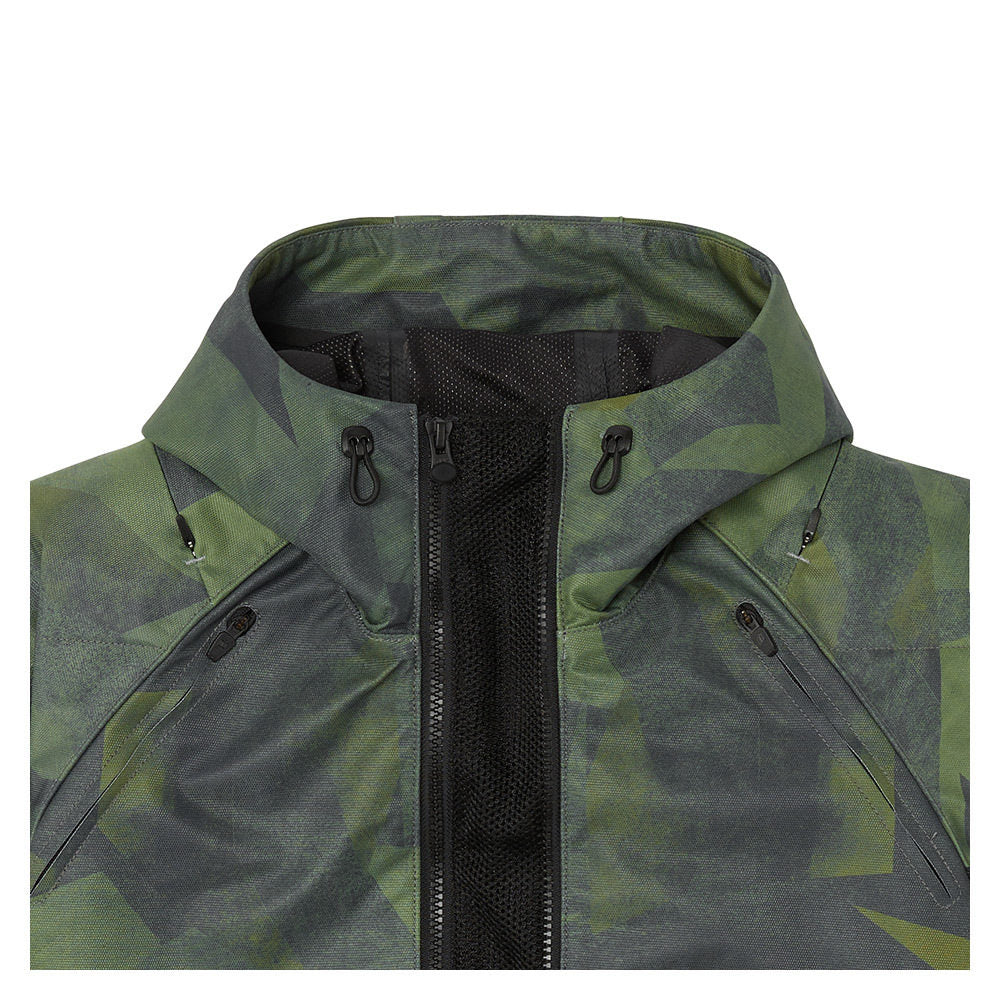 Based on northern European camouflage patterns and treated with a heavy dose of distressing, the Airform™ Battlescar motorcycle jacket is ready for duty. The relaxed fit chassis is built from lightweight reinforced polyester equipped with a full complement of D3O® impact protectors (shoulder, elbow, back). Sufficient for light showers, the Airform jacket comes with our waterproof level WP1 rating and hood. The hood stows away when not in use to eliminate drag. If used for summer riding, the AirFly™ mesh center vent and four zippered vents provide for the ultimate in airflow.
