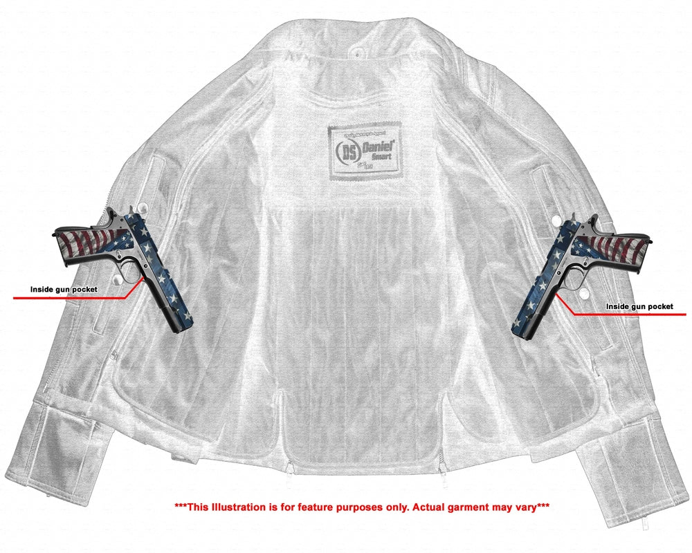 - 2 inside concealed gun pockets made of special heavy-duty textile with built-in holsters and snap closure.